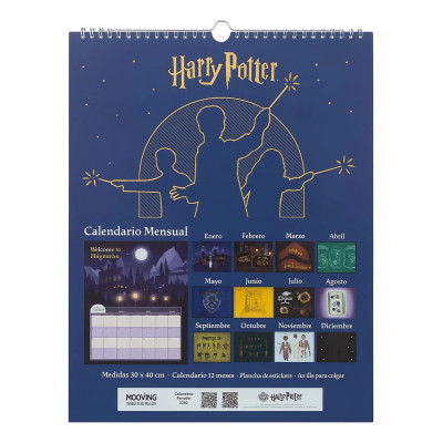Características del Producto -12 calendarios mensuales con ilustraciones diferentes de Harry Potter y sus amigos. -Incluye plancha de stickers full color para personalizar tus meses. -Formato 30x40 cm: tamaño práctico para colgar en tu pieza, sala o escritorio. -Anillado doble resistente para un colgado fácil y duradero. -Tapa semirígida con laca sectorizada + stamping que realza los detalles premium. -6 hojas de papel obra 250g de alta calidad para un acabado profesional.