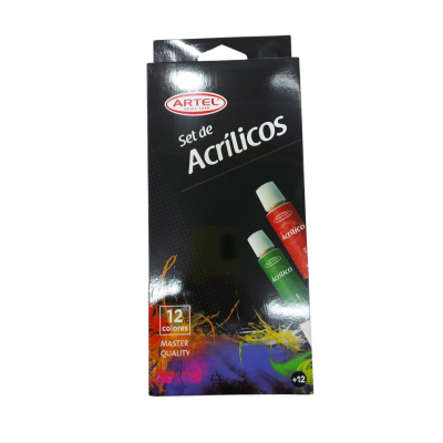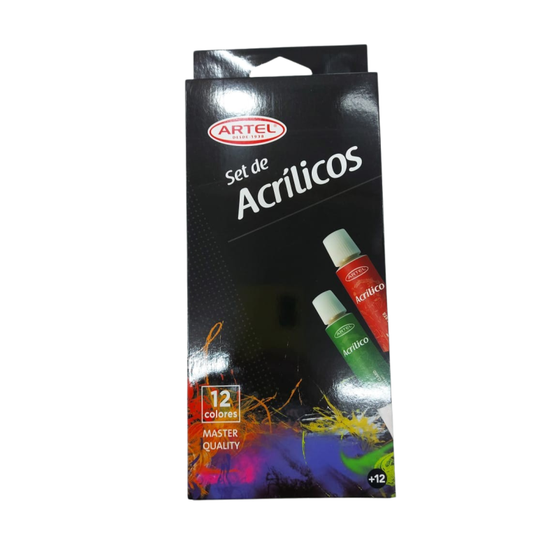 Set contiene 12 colores de 12ml; Blanco titanio 112, Negro Marfil 221, Azul cerúleo 441, Azul Ftalo 443,Verde claro 551, Verde Ftalo 552,amarillo ocre 661, Siena tostada 664, amarillo limón 772, amarillo medio 775, rojo escarlata 885 y rojo carmín 887.